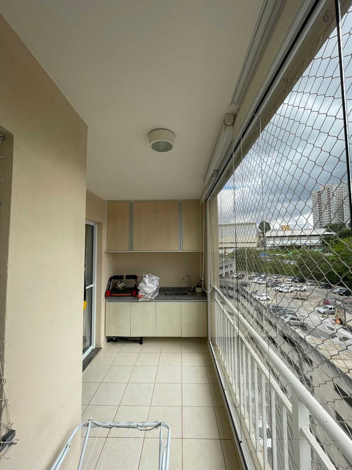 • Sacada envidraçada com persianas e rede de proteção